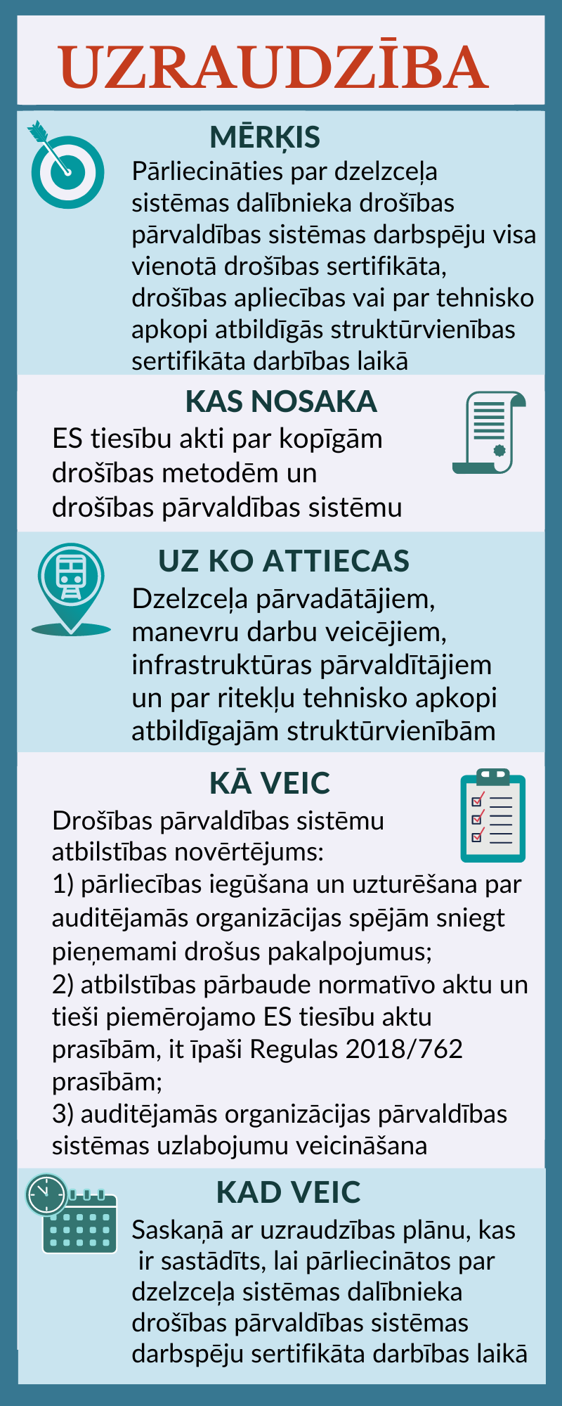 Mērķis: Pārliecināties par dzelzceļa sistēmas dalībnieka drošības pārvaldības sistēmas darbspēju visa vienotā drošības sertifikāta, drošības apliecības vai par tehnisko apkopi atbildīgās struktūrvienības sertifikāta darbības laikā.